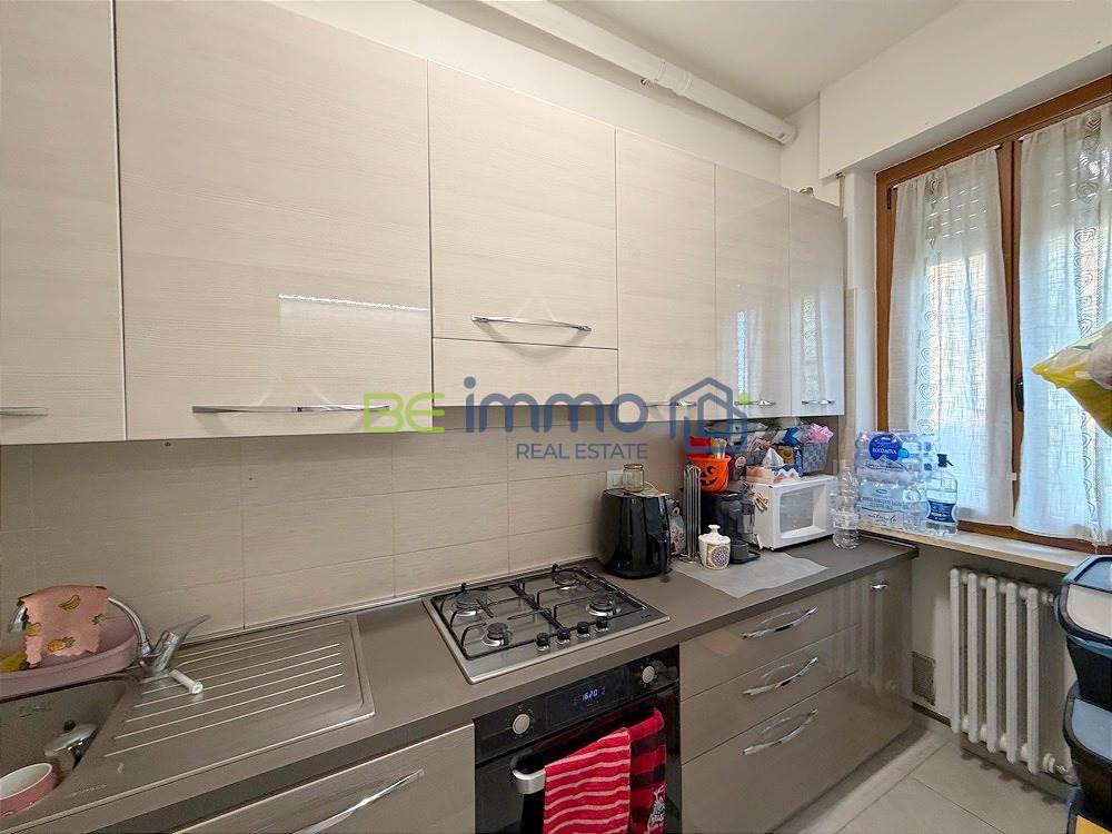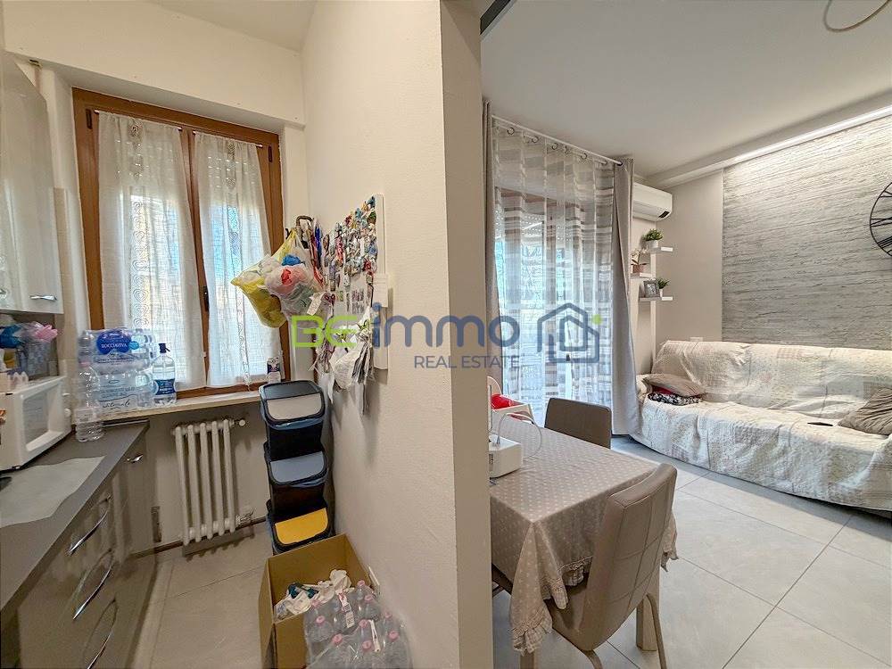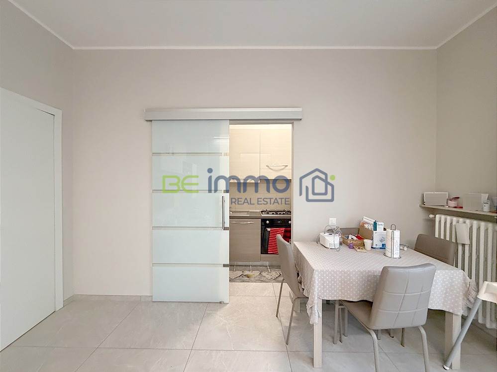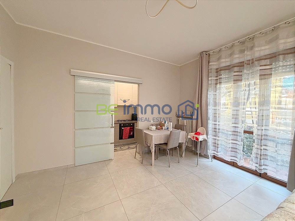 L’ingresso si apre su un corridoio ben organizzato dove troviamo subito un comodo armadio a muro, ideale come spazio contenitivo. Proseguendo si accede alla zona giorno composta da soggiorno con sala da pranzo e cucina separata, dotata di finestra e collegata alla zona living tramite una porta scorrevole in vetro, soluzione pratica che permette di mantenere gli ambienti distinti ma allo stesso tempo comunicanti. Dal soggiorno una portafinestra conduce al balcone esposto a est, che prosegue anche lungo la camera adiacente.